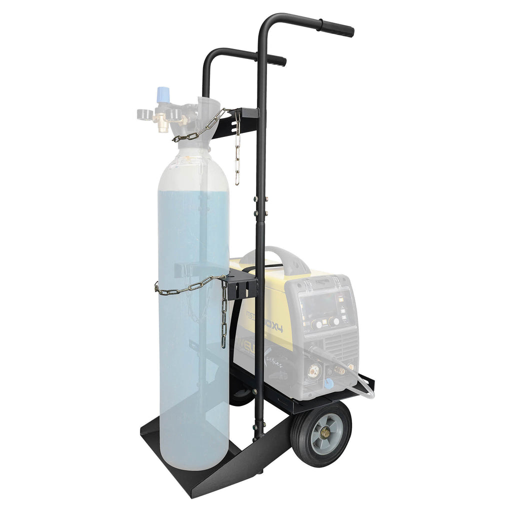 This portable X-Cart Welders Trolley is designed to be compact; ideal for moving a single argon cylinders and a welder machine together from location to another with ease in a welding environment, featuring an adjustable steel tray with strap, sturdy front handle and heavy duty wheels. Suitable for a full size gas bottle.